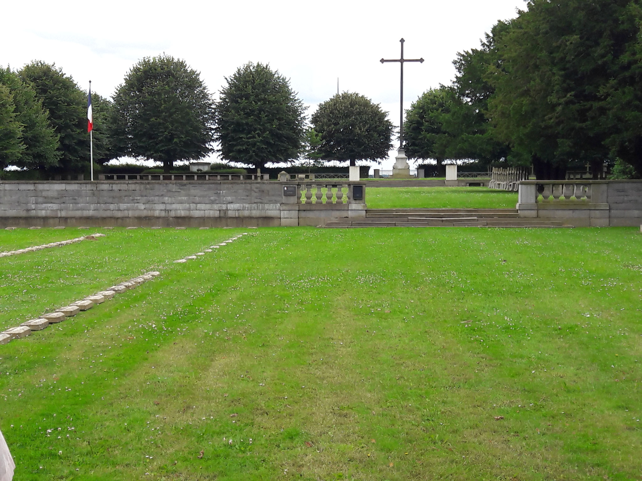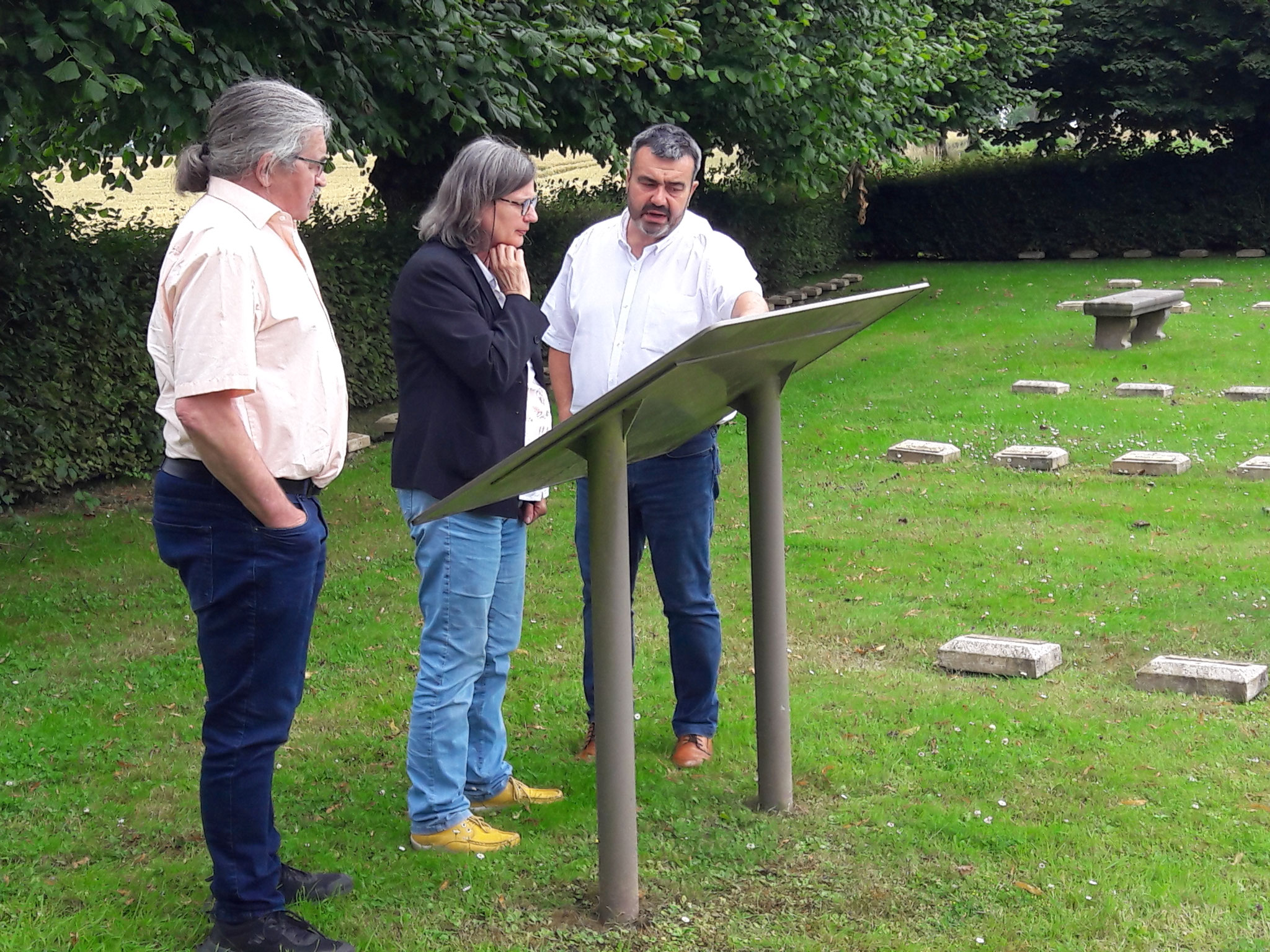 Es war auch Vincent Lamoureux, der uns eine Besichtigung des Soldatenfriedhofs „Le Sourd“ anbot, welcher sich nur wenige Kilometer von Sains-Richaumont entfernt befindet. Vom 27. – 29. August 1914 fand hier die „Bataille de Guise“ (in Deutschland wird sie als Schlacht von Saint Quentin bezeichnet) statt, eine der ersten großen Schlachten des 1. Weltkrieges. Inmitten einer friedlichen Idylle von Wiesen und Feldern wird einem bewusst, dass hier vor mehr als hundert Jahren fürchterliche Kämpfe tobten. Deutsche und Franzosen, jung und hoffnungsvoll, mussten einem Schießbefehl folgen und verloren ihr Leben auf dem Schlachtfeld. Bekannte Deutsche, unter anderem Leutnant Heinrich von Bismarck (Enkel des Reichskanzlers Otto von Bismarck), Leutnant Karl Wilhelm von Plettenberg und Hauptmann Egbert von Witzleben sind hier gefallen. Aufgefallen ist uns, dass sich hier viele Namen finden, die uns im Verlauf der weiteren deutschen Geschichte als Widerstandskämpfer, auch im Zusammenhang mit dem Attentat vom 20. Juli 1944, bekannt wurden. Der Friedhof wurde 1916 in Anwesenheit von Kaiser Wilhelm II. eingeweiht. Es ruhen dort 699 deutsche Soldaten, 1.333 französische Kriegstote, 25 Russen, 2 Italiener und 1 Rumäne. Auch 5 französische Kriegsgefallene des 2. Weltkrieges wurden hier bestattet.
