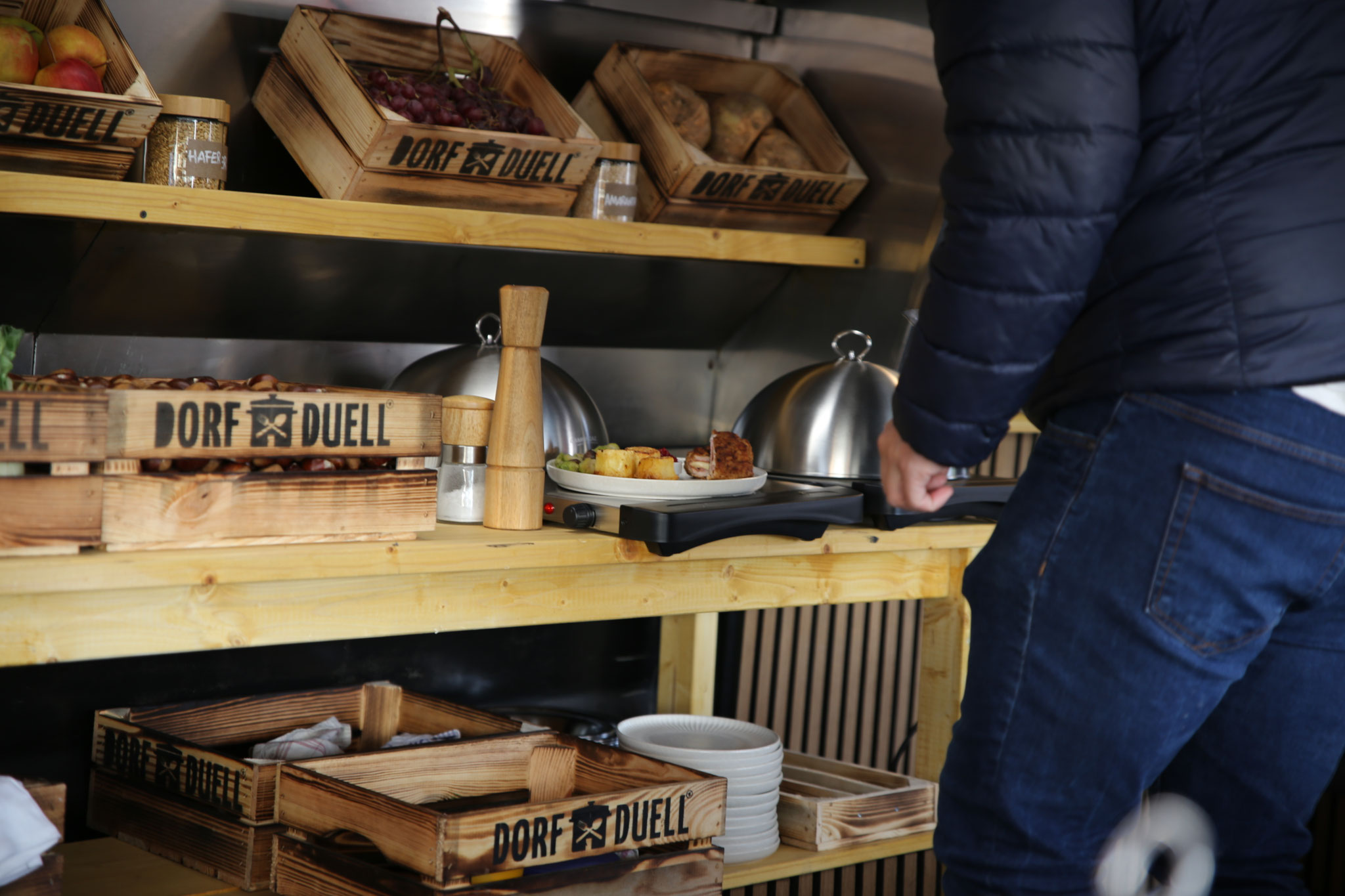 Für unser Dorf traten drei begabte Köchinnen und Köche an den Herd: Manuel Fillgraff bereitete die Vorspeise zu, eine herbstliche Kürbisquiche mit Feldsalat und Schnittlauch-Dip. Das Hauptgericht übernahm Andreas Thiel, der ein Cordon Bleu vom Menger-Bolcher Landschwein mit Rosenkohl, karamellisierten Maronen und Fondant-Kartoffeln servierte. Den süßen Abschluss gestaltete Heike Ludt mit ihrem Dessert „Ritter Bolch von Mengen mit seinem rot-weißen Gefolge“, eine kreative Interpretation des klassischen Gerichts „Rostige Ritter“.
