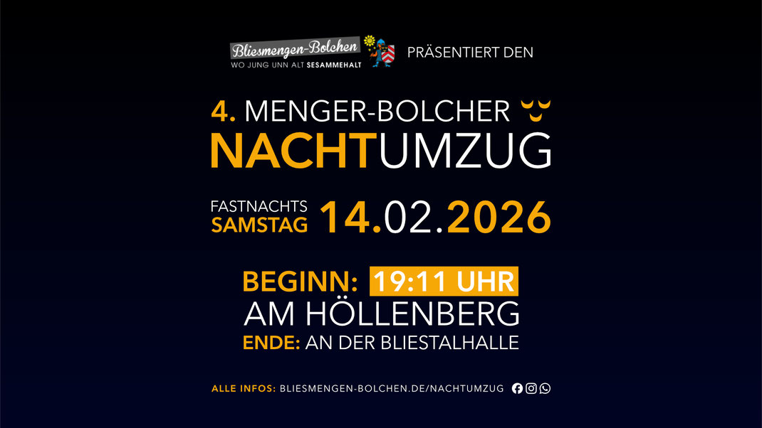 Der 3. Menger-Bolcher Nachtumzug beginnt am Fastnachtssamstag, den 1. März 2025 um 19:11 Uhr in der Straße Am Höllenberg, Höhe Nr. 12, und führt über die Straßen Im Oberen Mengen, Kettelerstraße und Sains-Richaumont-Straße zur Bliestalhalle in der Ritterstraße. Den detaillierten Streckenverlauf findet ihr hier.