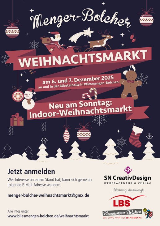 Bei sämtlichen Fragen zur Teilnahme erreichen Sie die Arbeitsgruppe Weihnachtsmarkt per E-Mail an: menger-bolcher-weihnachtsmarkt@gmx.de